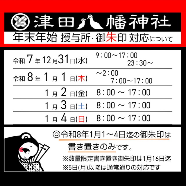 新年1月1〜4日迄は、御朱印が書き置き対応となります。